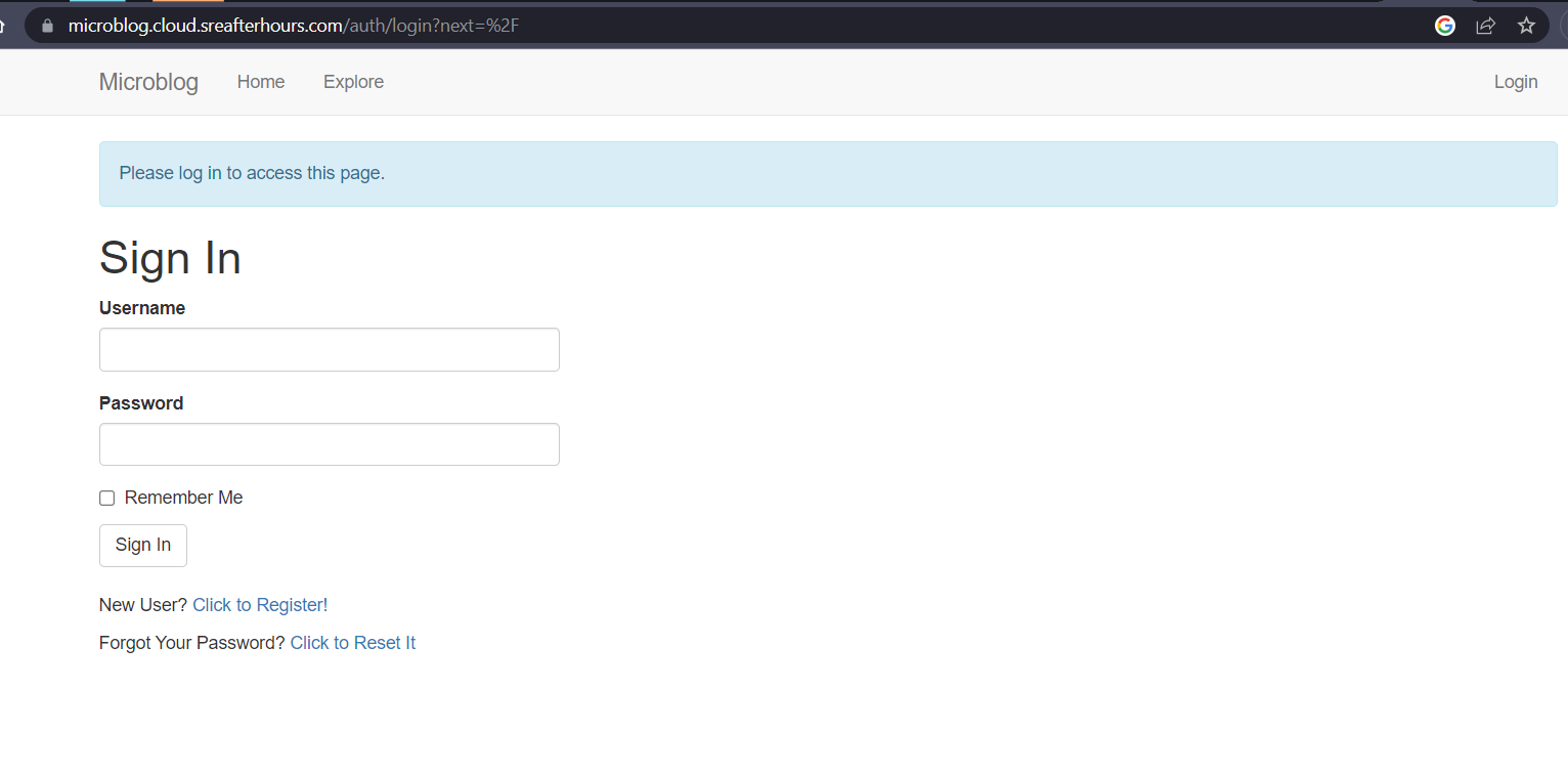 Application is now available at https://microblog.cloud.sreafterhours.com.
